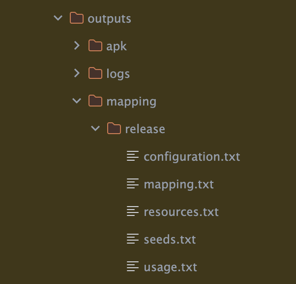 앱을 빌드 후 생성되는 outputs/mapping/release 폴더에는 많은 txt 파일이 생성되는데 이는 난독화 적용 이후 크래시 분석에 필수로 사용된다. 여기서 각 파일이 담고 있는 내용은 아래와 같다.